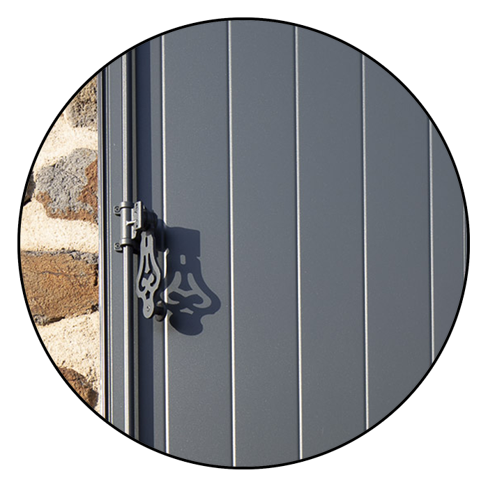 Le volet est composé d’un panneau de fibre de bois (21mm) recouvert de deux épaisses tôles aluminium (1.1mm). Ce complexe est ainsi très robuste et protège d’avantage des éventuels chocs.
